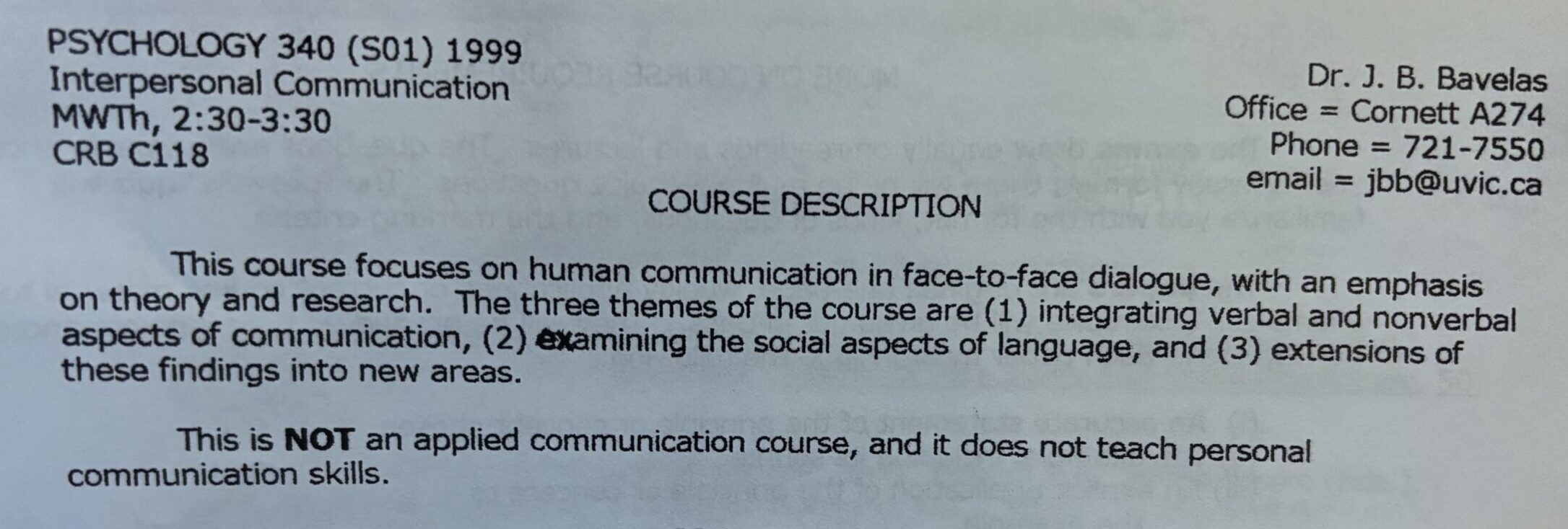 My first class with Janet Bavelas was Psych 340, Interpersonal Communication (January–April 1999).